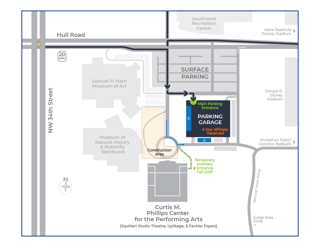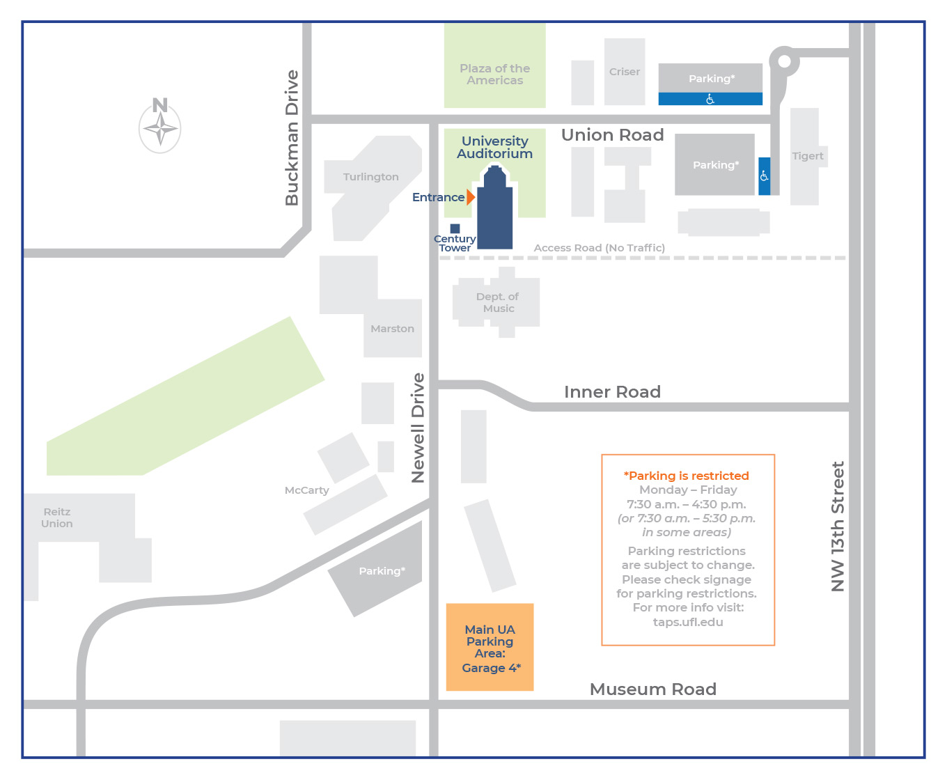 Parking is available in the parking garage and the surface lots at the University of Florida Cultural Plaza. Parking is free on weekends and after 3:30pm on weekdays (prior to that on weekdays these lots require a UF Parking Decal). Free parking is also made available for all Phillips Center events (including lifting parking restrictions for events during weekdays). View a PDF of the Phillips Center Parking Map »